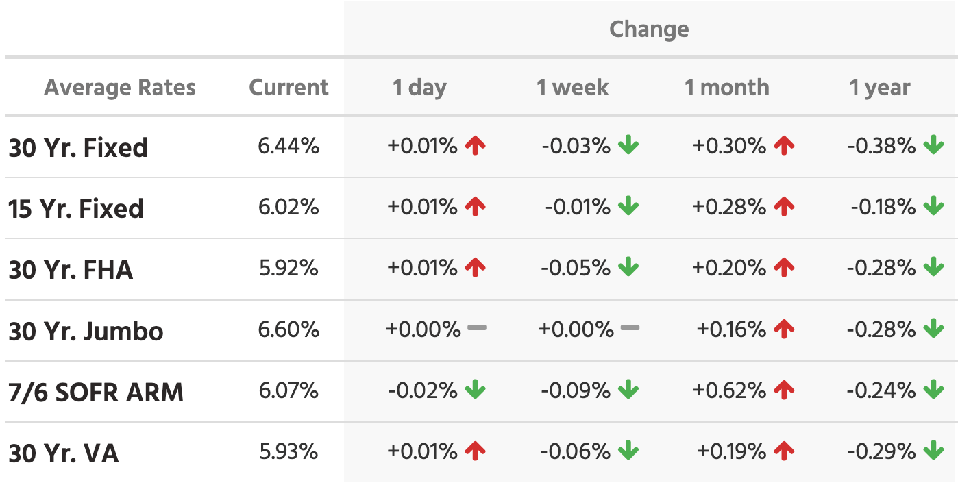 Mortgage rates moved slightly lower this week. The 30-year fixed is now at 6.44% — down a tiny amount from last week. But rates have climbed about 0.30% over the past month, unwinding some of the relief from February when rates nearly touched 6%. One year ago, rates were around 6.82%, so today's rates are 0.38% lower than a year back.
