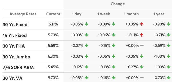 Mortgage rates moved lower this week, with the 30-year fixed now around 6.11%. Most loan types are down both week-over-week and year-over-year. Compared to one year ago, rates are roughly 0.7% to 1.0% lower, and adjustable products are down even more. The short-term trend is easing slightly.