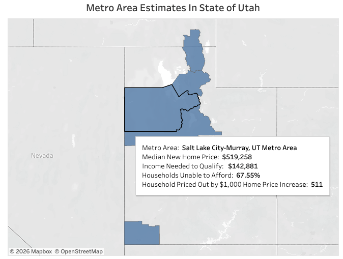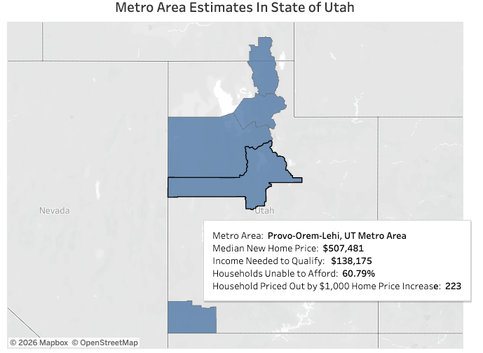 At a 6% mortgage rate, buyers need to earn nearly $146,000 annually just to qualify for the average Utah home. In Salt Lake City, 68% of households can't afford to buy. In Provo-Orem-Lehi, it's 61%. As shown in the charts above, even a $1,000 price increase would push hundreds more families out of the ownership market — and into yours.