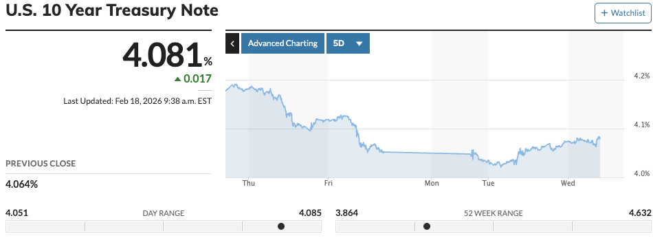 The 10-year Treasury is sitting near 4.08%, drifting lower over the past several days and pulling mortgage rates down with it. Overall, rates are softening, but they remain within a relatively tight range rather than breaking decisively in either direction.