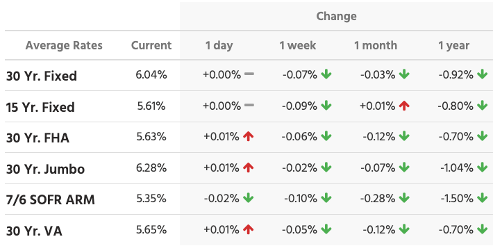 Mortgage rates moved lower this week, with the 30-year fixed now around 6.04%. Most loan types are down week-over-week and clearly lower year-over-year. Compared to one year ago, rates are roughly 0.7% to 1.0% lower, and adjustable products like the 7/6 SOFR ARM are down even more (about 1.5% lower than a year ago). The short-term trend is easing slightly.